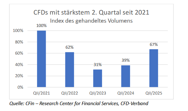 So wurde mit CFDs im zweiten Quartal 2025 ein um 19 Prozent höheres Volumen gehandelt als noch im ersten Jahresviertel. Noch stärker fiel das Plus im Vergleich zum Vorjahresquartal aus, um mehr als 73 Prozent ging es mit dem Volumen gegenüber dem Vergleichszeitraum nach oben.